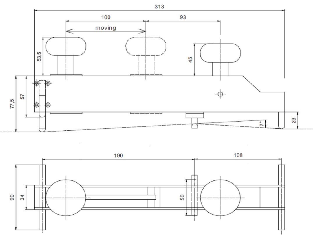 前端“可移動式旋鈕”被推動時,使得中間的測量桿向下突出,如果經(jīng)紗張力很高,可將測量桿平行于經(jīng)紗,將測量桿穿到經(jīng)紗下,然后將測量桿旋轉(zhuǎn)到與經(jīng)紗運動方向垂直。