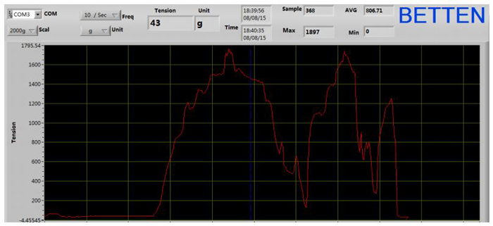 6. GTX張力儀有可連接電腦的USB接口,可以把測量數據存儲到電腦上,也可以把測量過程以波形的方式顯示出來,方便客戶分析,數據存儲速率可達每秒10個。